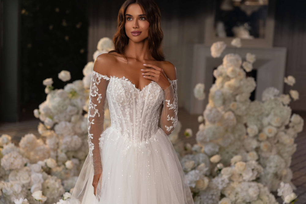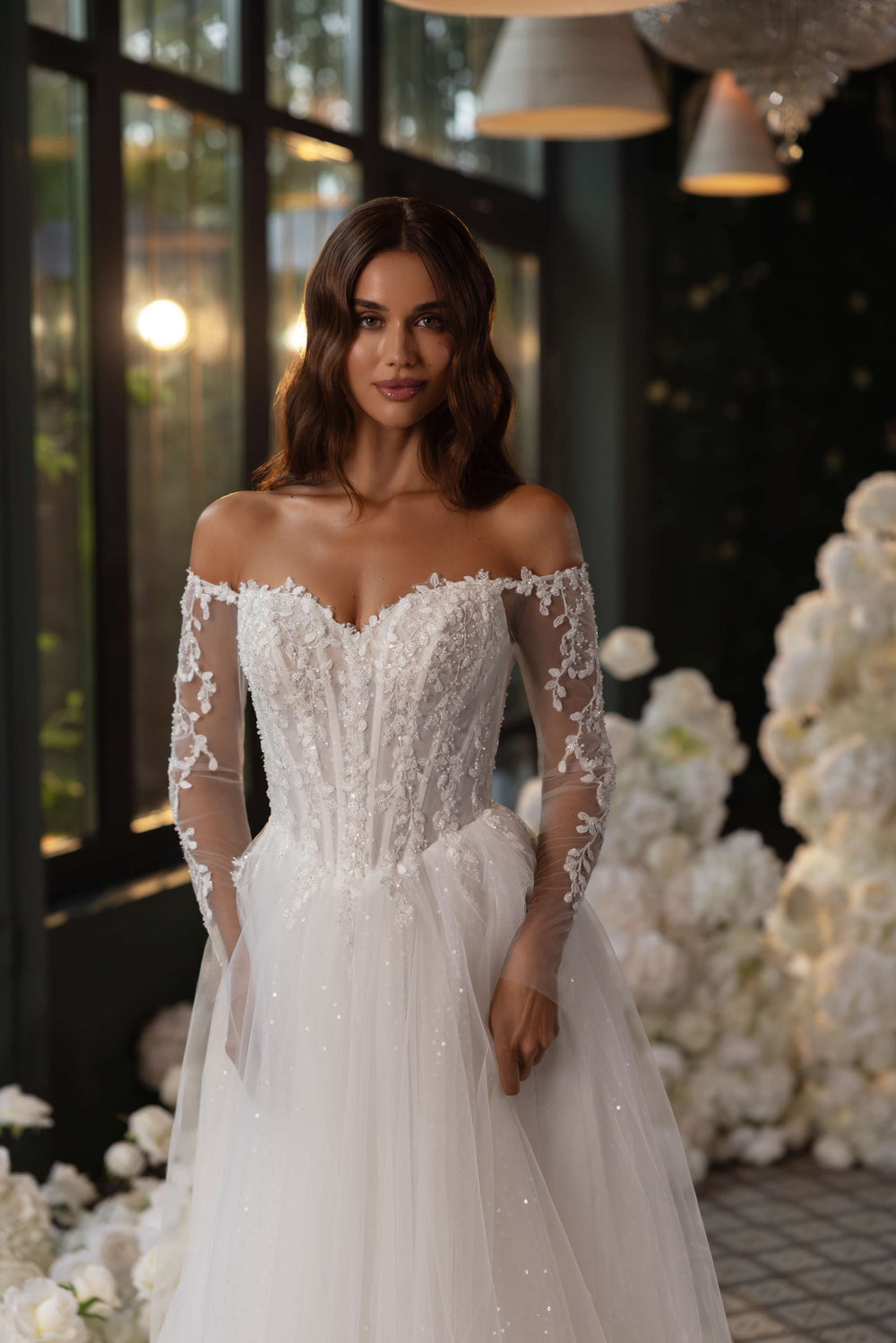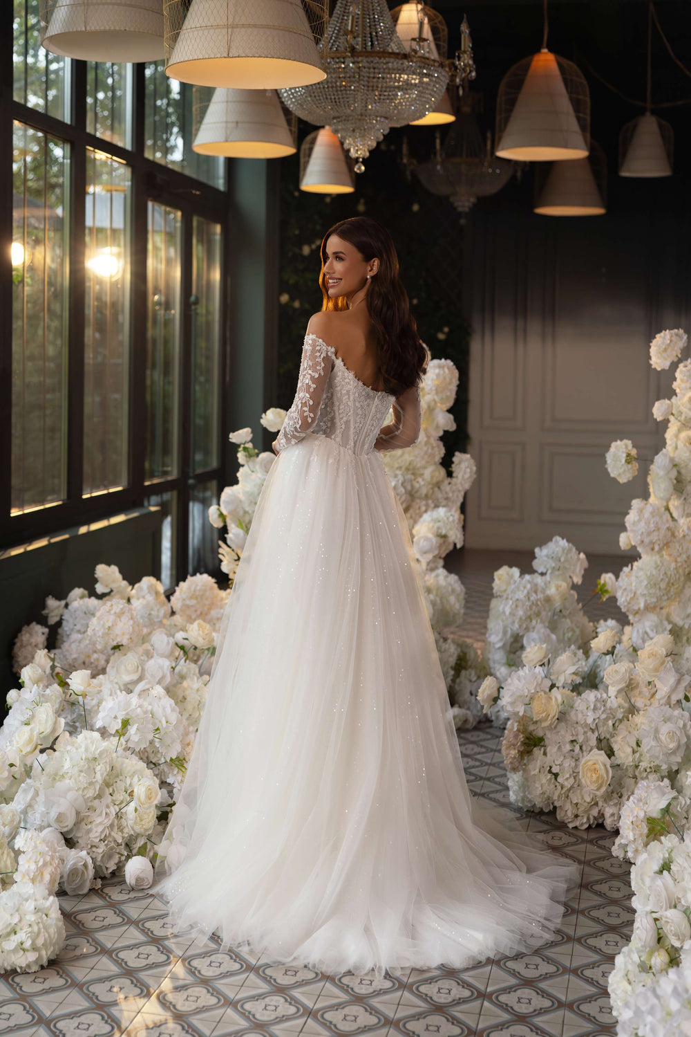 Mâneci lungi din tulle transparent, decorate cu dantelă florală, se așază ușor pe umeri într-un decolteu tip inimă cu efect off-the-shoulder, oferind un aer fermecător și ultra-feminin. Fusta din straturi vaporoase de tulle are o sclipire subtilă la fiecare pas, perfectă pentru ceremonii de seară sau lumina caldă a apusului.