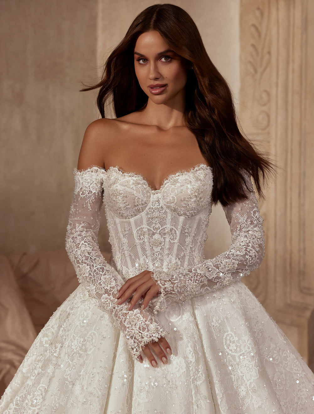Decolteul în formă de inimă, purtat pe umeri goi, pune în valoare linia gâtului, iar mânecile lungi din dantelă conferă finețe și rafinament. Fusta amplă, din straturi bogate acoperite cu dantelă brodată și paiete discrete, se termină într-o trenă grațioasă pentru un efect de basm.