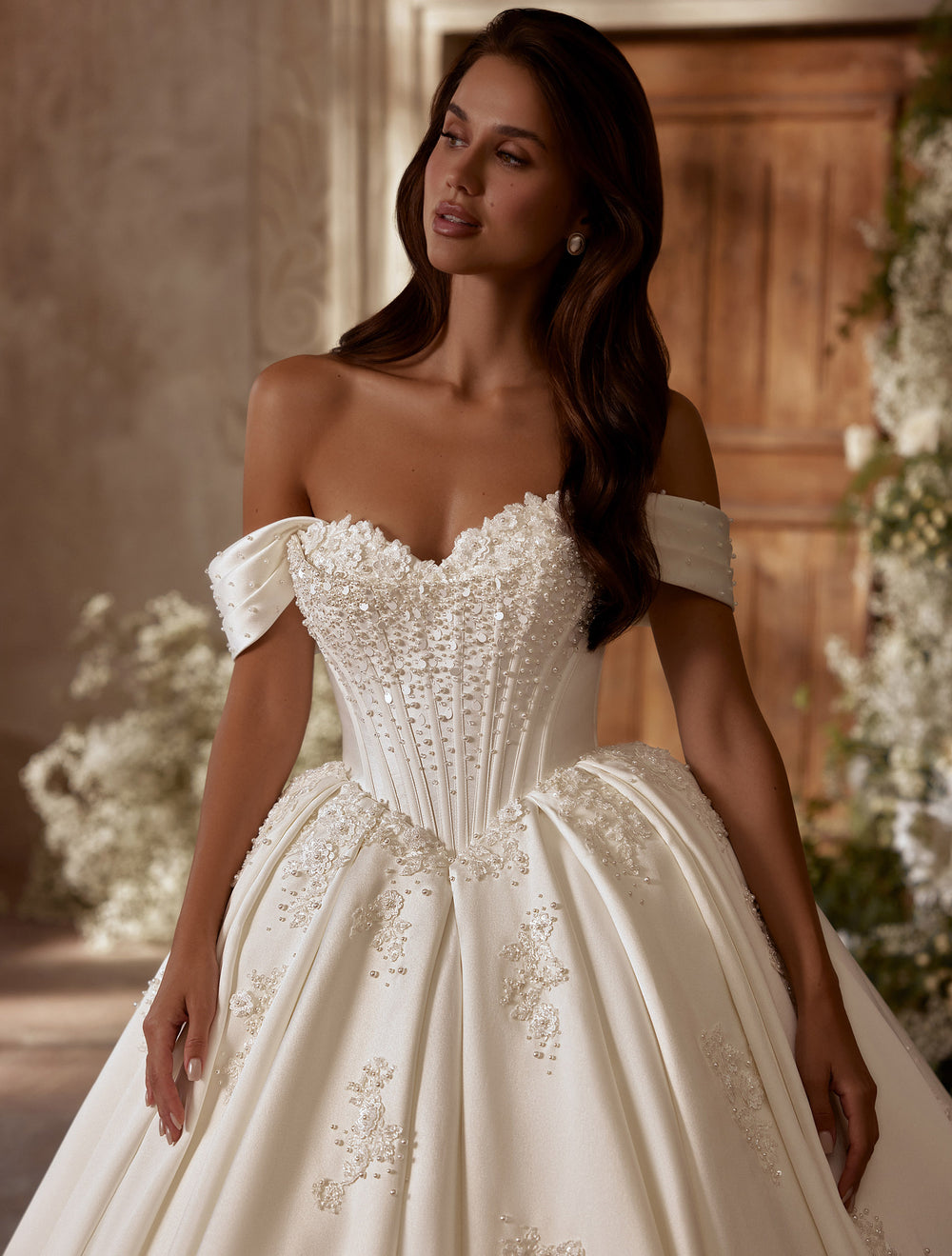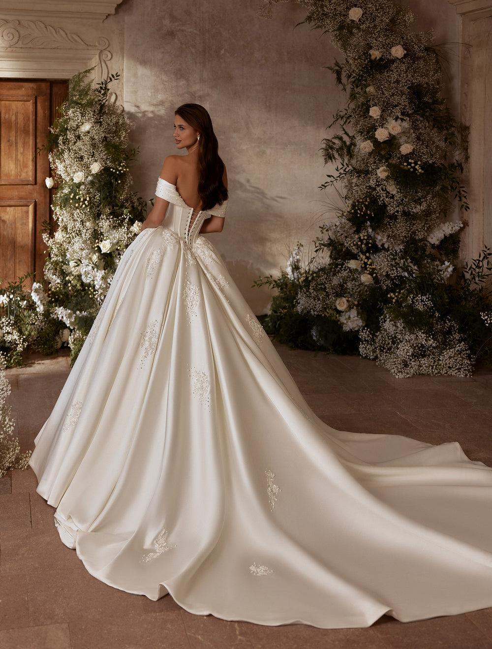 Amira este rochia care transformă intrarea ta într-un moment regal. Siluetă prințesă, corset sculptat și detalii strălucitoare ce captează lumina – totul într-o compoziție rafinată, feminină și atemporală. Decolteul inimă cu umeri căzuți conturează delicat bustul, în timp ce fusta amplă, cu pliuri arhitecturale, poartă aplicații florale brodate presărate cu finețe. Trena elegantă completează tabloul cu un aer de poveste.