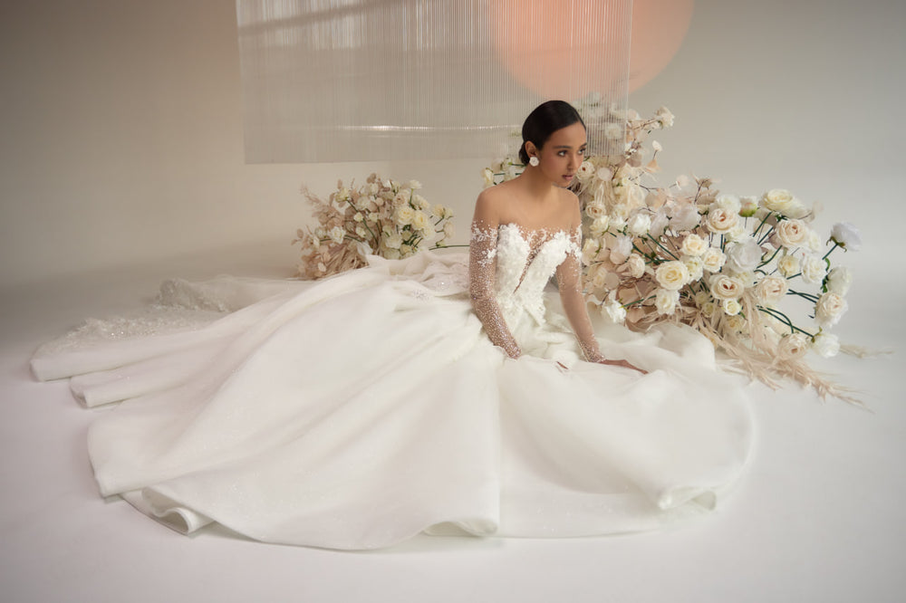 Corset & Decolteu: Rochia de mireasă Anastasia impresionează printr-un corset senzaționant, decorat cu aplicații florale detaliate. Decolteul adânc în formă de V adaugă un element de senzualitate, rămânând în același timp sofisticat. Pe lângă transparența subtilă, marginea corsetului prezintă broderii complicate care se îmbină perfect cu mânecile.
