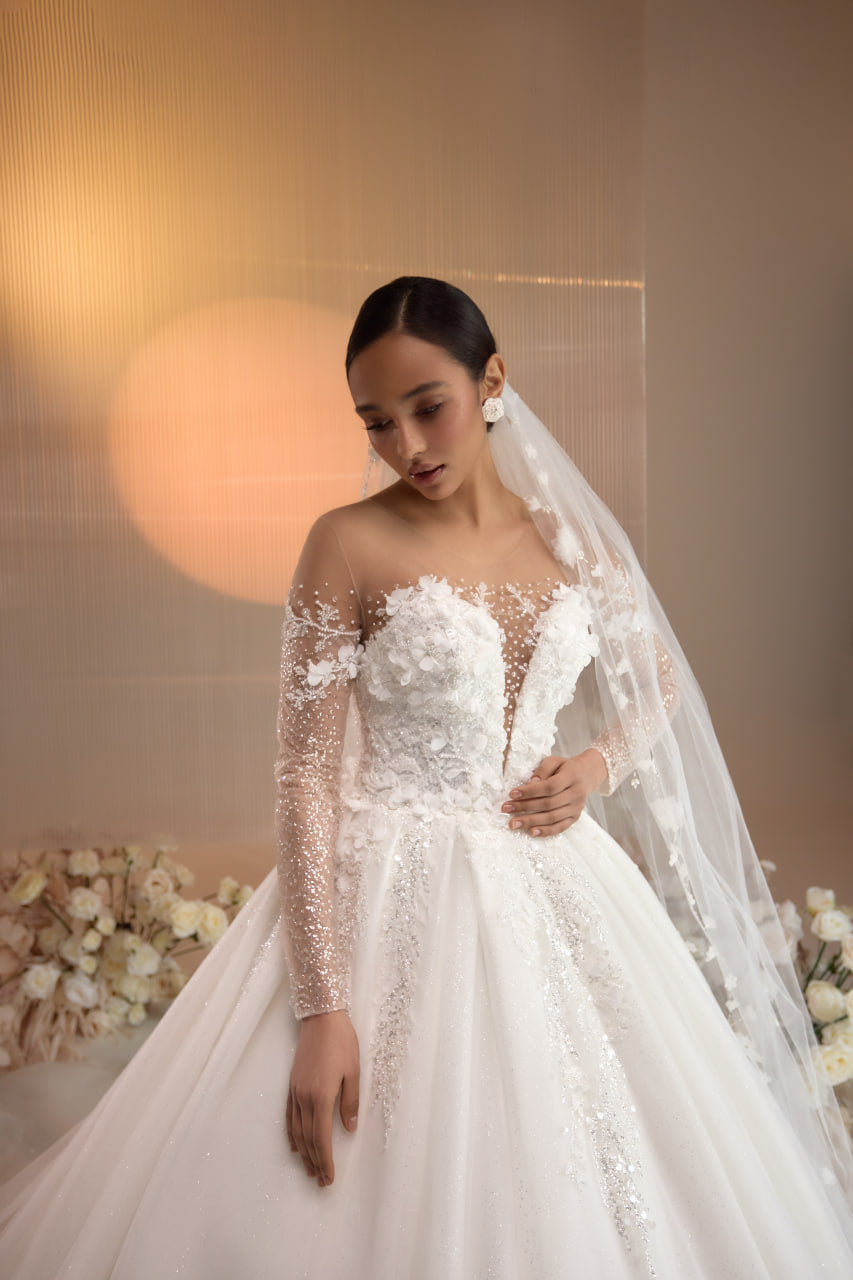 Mânecile: Mânecile lungi adaugă o notă romantică și sunt confecționate din tiul fin, decorat cu aceleași aplicații florale ca și corsetul, oferind o continuitate elegantă și rafinată.