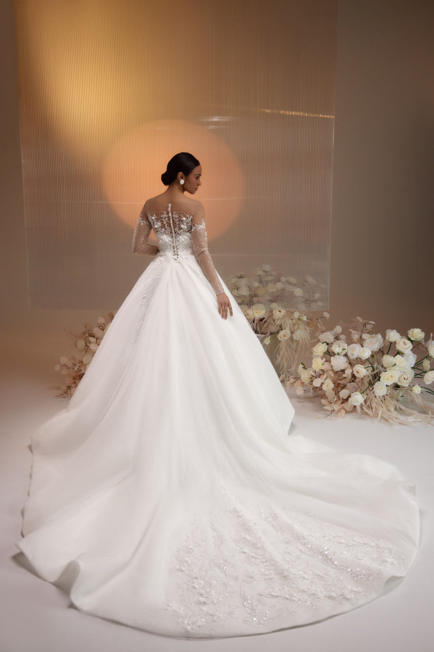 Fusta:Fusta din tiul oferă un volum amplu și fluiditate, potrivită pentru o intrare grandioasă. Stratul superior este împodobit cu incrustații delicate ce reflectă subtil lumina, adăugând un efect strălucitor fiecărui pas. Această fustă se termină într-o trenă spectaculoasă care conferă un aer regal și o mișcare grațioasă.