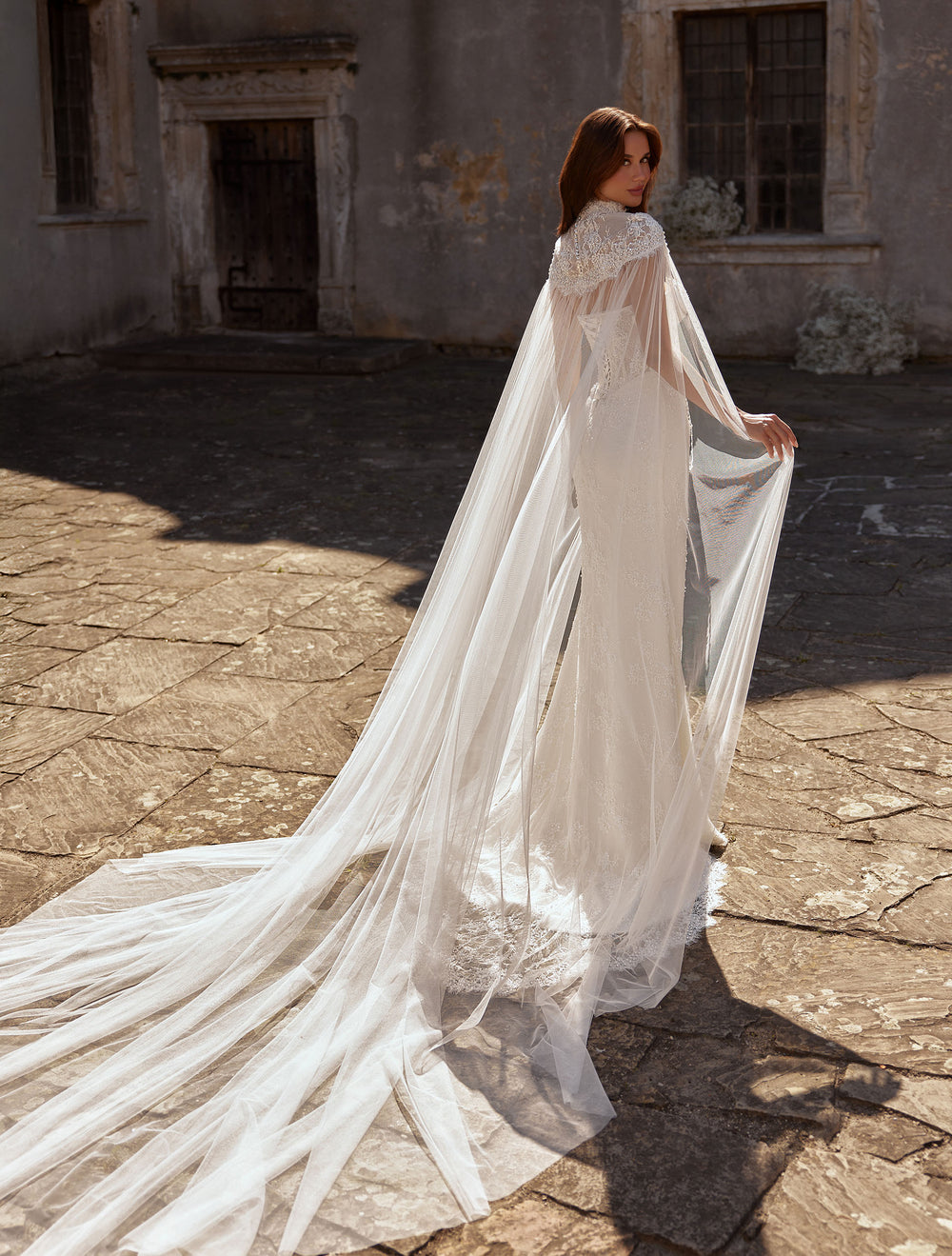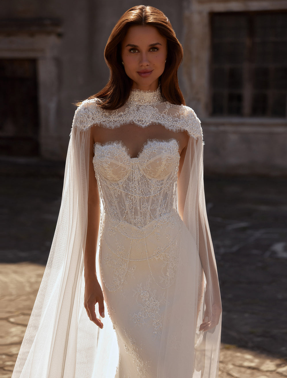 Rochie de mireasă cu capă din tulle, dantelă și croi sirenă