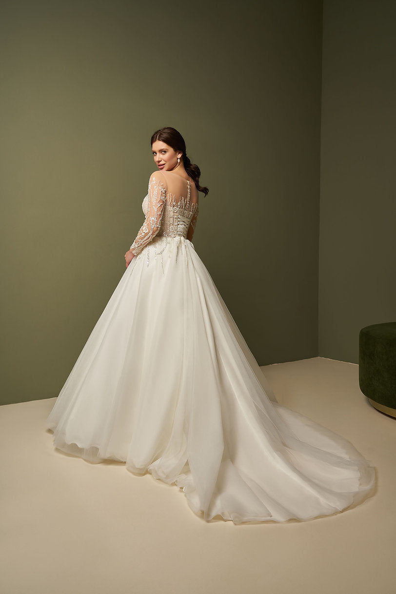 Corsetul cu efect de iluzie, bogat brodat și ușor strălucitor, se continuă cu mâneci lungi transparente, iar fusta amplă din straturi fluide conturează o siluetă de prințesă irezistibilă.