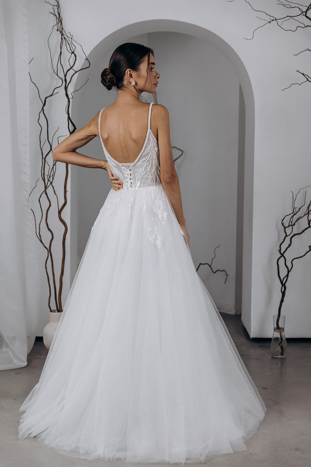 Rochia de mireasă Brooke impresionează cu un corset superb, decorat cu aplicații de dantelă fină. Aceste detalii intricate se extind de-a lungul bustului și conferă un aer de noblețe și rafinament. Decolteul adânc în V este echilibrat perfect de bretelele subțiri, adăugând un plus de feminitate și grație.