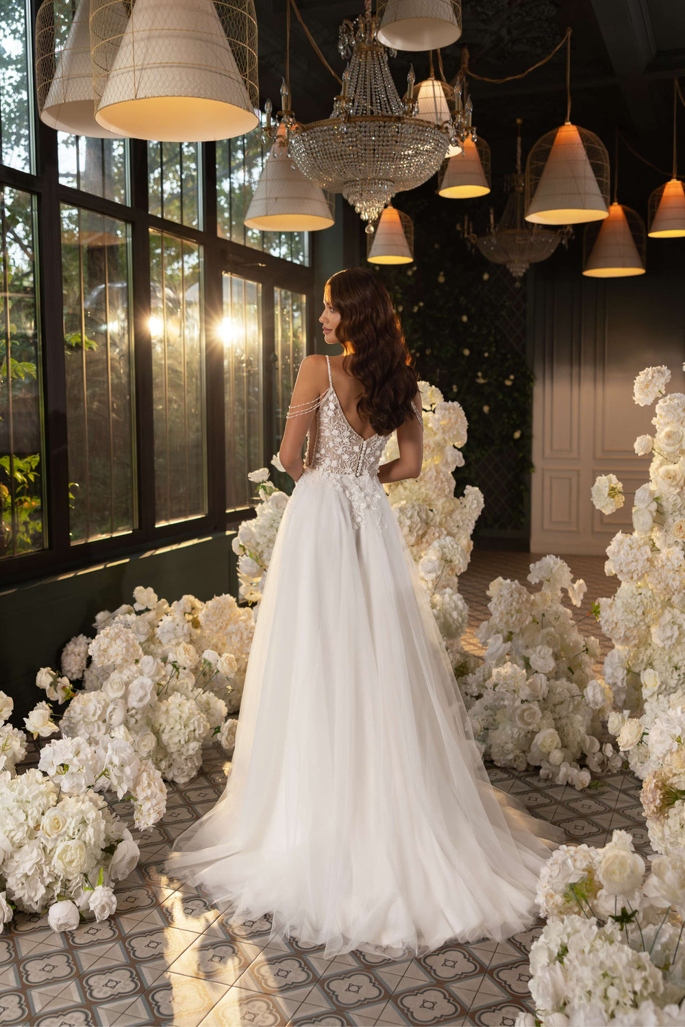 Silueta A-line subțiază talia și curge lejer într-o fustă vaporoasă din straturi fine de tulle, încheiată cu o trenă diafană ce plutește grațios la fiecare pas.