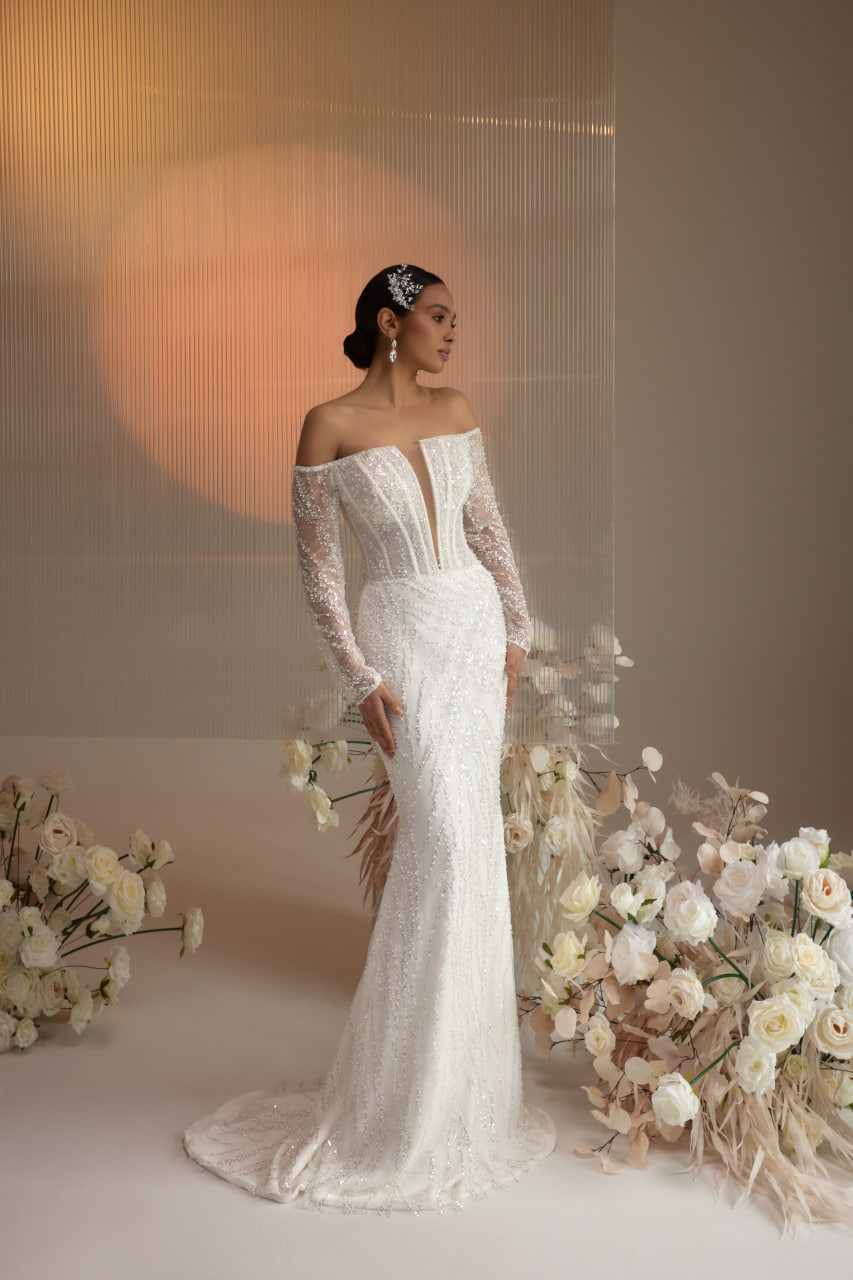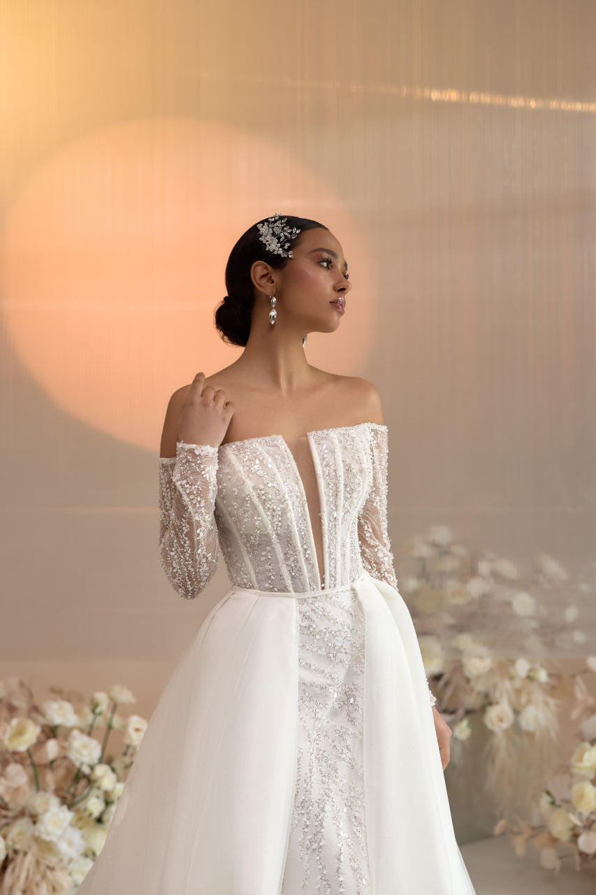 Rochia de mireasă Demetria se remarcă prin linia sa elegantă și croială de tip sirenă, care pune în valoare silueta miresei. Bustul are o formă decoltată tip V și vine cu un detaliu transparent central care adaugă un aer sofisticat și rafinat întregii ținute.