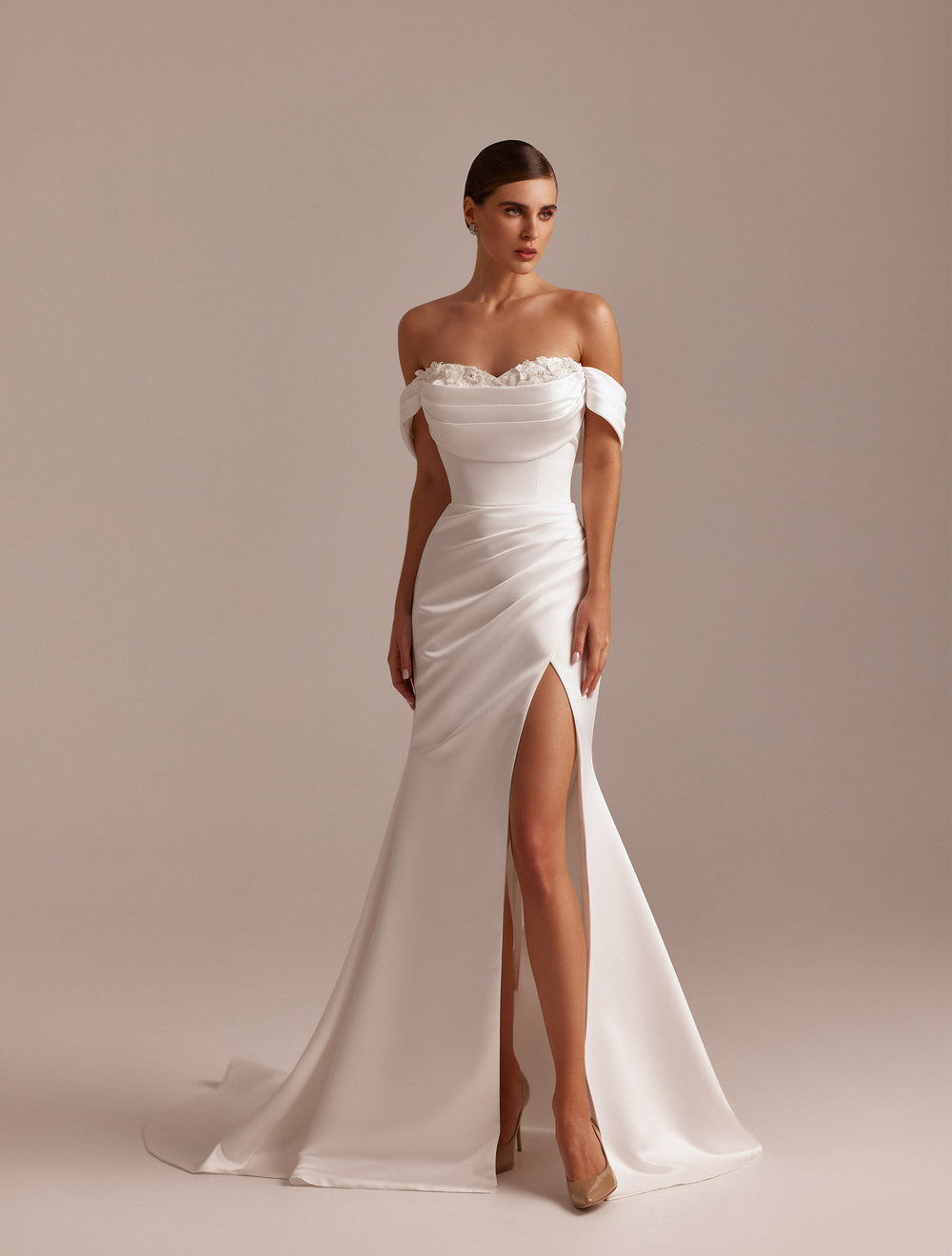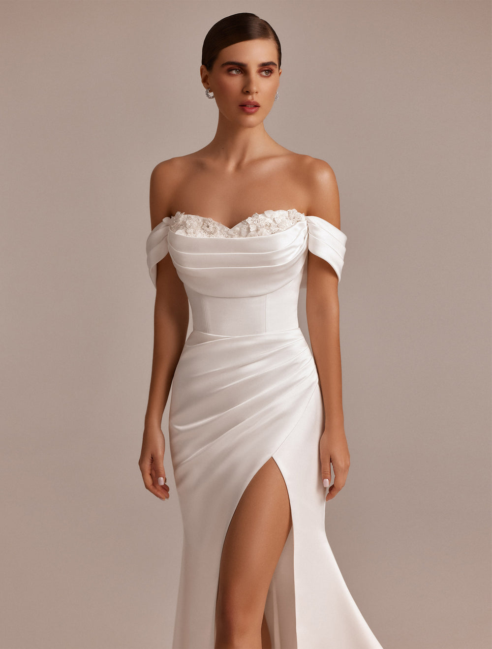 EL-470 îmbină liniile curate ale unei rochii tip columnă cu detalii couture: decolteu inimă, umeri căzuți cu pliuri moi și aplicații fine de dantelă ce conturează delicat bustul. Drapajul oblic din talie alungește silueta, iar fanta înaltă pe picior adaugă un strop de senzualitate și lejeritate în mișcare. Țesătura cu finisaj satinat cade impecabil și se continuă într-o trenă fluidă, discretă.