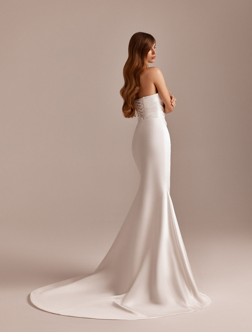 EL-476 este rochia pentru mireasa care iubește eleganța modernă. Construită pe linii curate, din satin cu luciu fluid, rochia îmbrățișează grațios formele și creează un efect sculptural prin drapajele diagonale, accentuate de inserții fine de dantelă cu detalii perlate. Decolteul fără bretele, cu linie ușor în formă de inimă, conturează delicat zona bustului, iar șlițul lateral alungește silueta și adaugă o notă seducătoare, păstrând în același timp un rafinament impecabil. Trena lejeră glisează suav la fiecare pas, completând o apariție sofisticată, fotogenică din orice unghi.