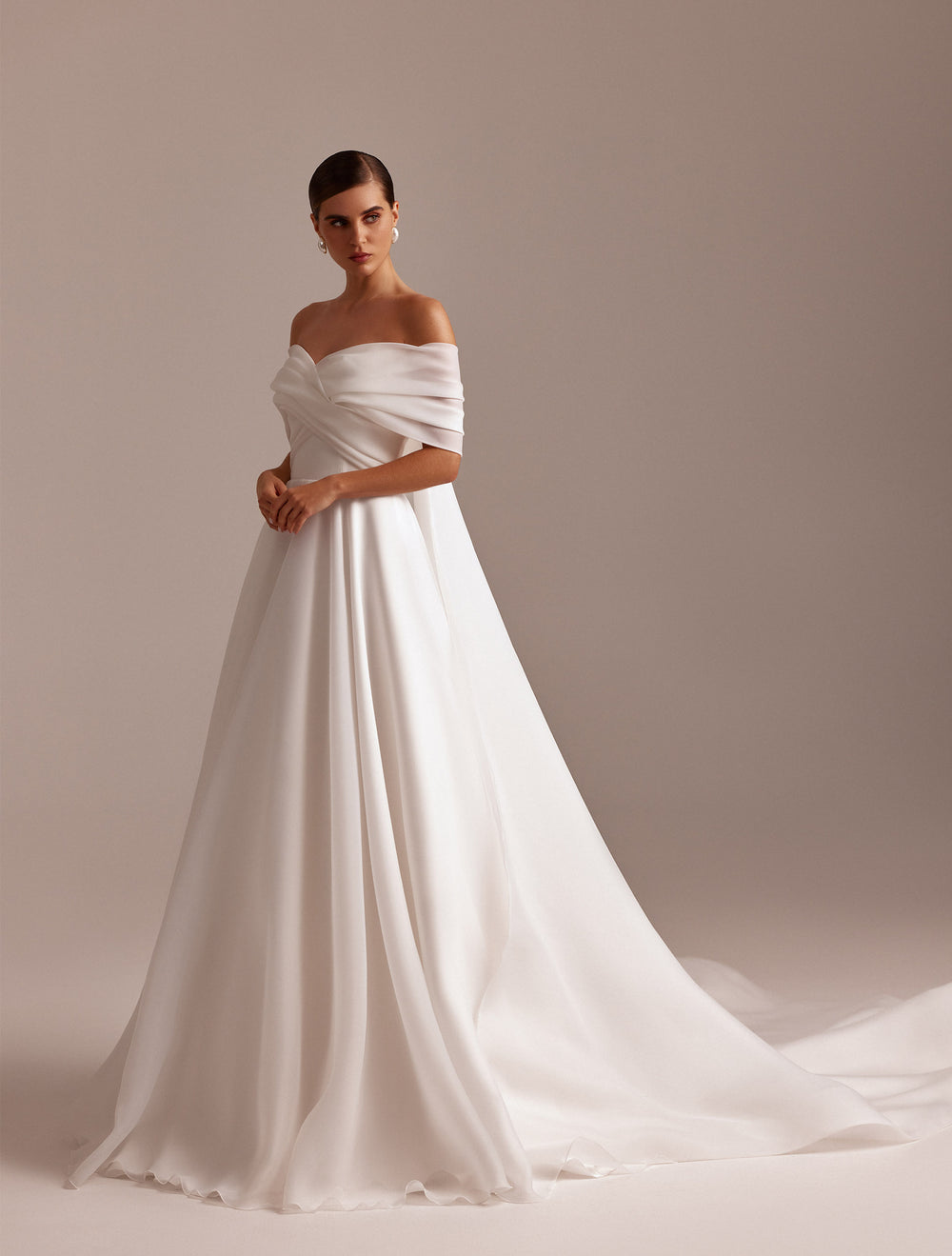 Eleganță pură într-o siluetă atemporală. EL-486 îmbină minimalismul modern cu feminitatea clasică: un decolteu tip Bardot (off-the-shoulder) cu drapaje fine ce învăluie umerii, un corsaj care definește talia și o fustă amplă în linie A ce curge fluid într-o trenă grațioasă. Țesăturile cu luciu mătăsos și căderea ușoară oferă mișcare catifelată la fiecare pas, conturând o apariție impecabilă în ziua nunții.