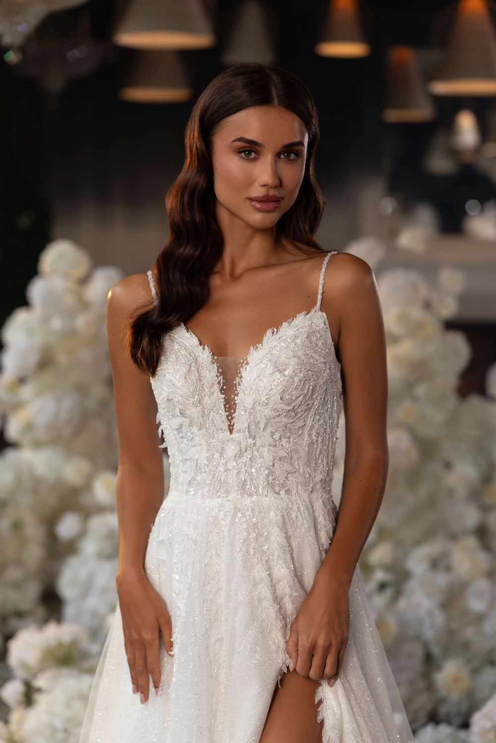 Corsetul cu bretele fine și decolteu adânc în V, susținut de tulle invizibil, este acoperit cu aplicații florale 3D ce creează textură și lumină.