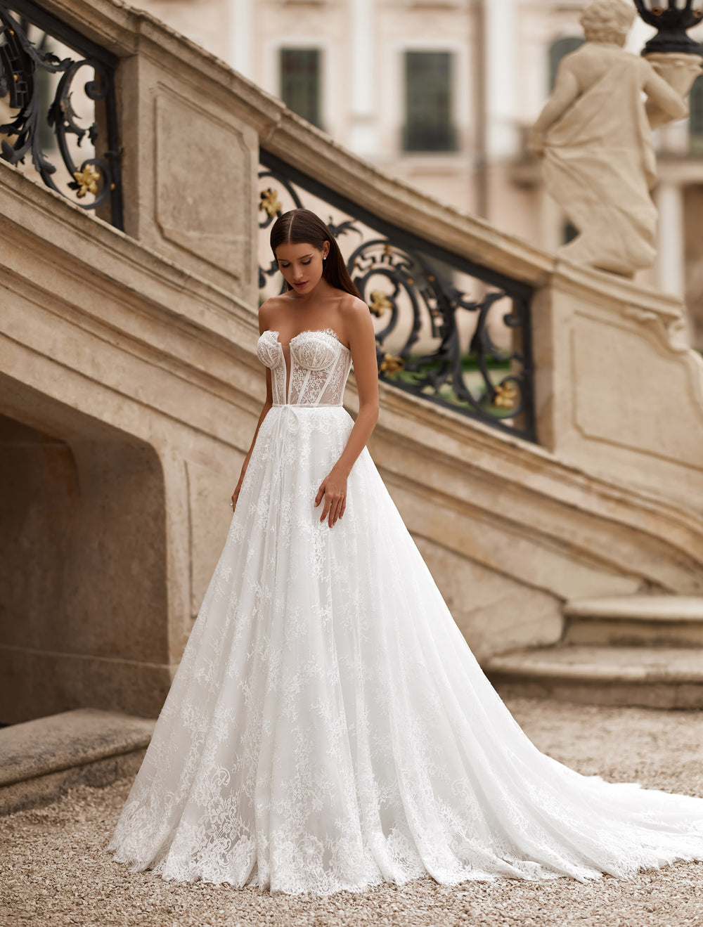 J-1115 este rochia care îmbină romantismul dantelei cu linia modernă a unui corset bustier. Fără bretele, cu decolteu inimă și fustă amplă în A, această creație evidențiază talia și oferă o siluetă regală, perfectă pentru un „da” memorabil.
