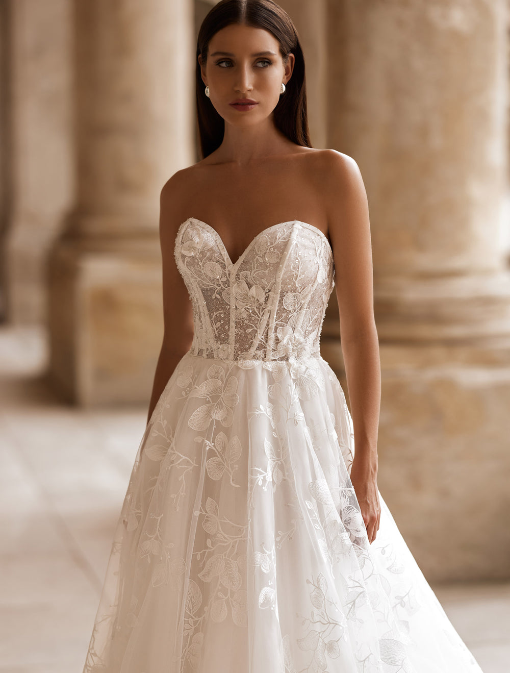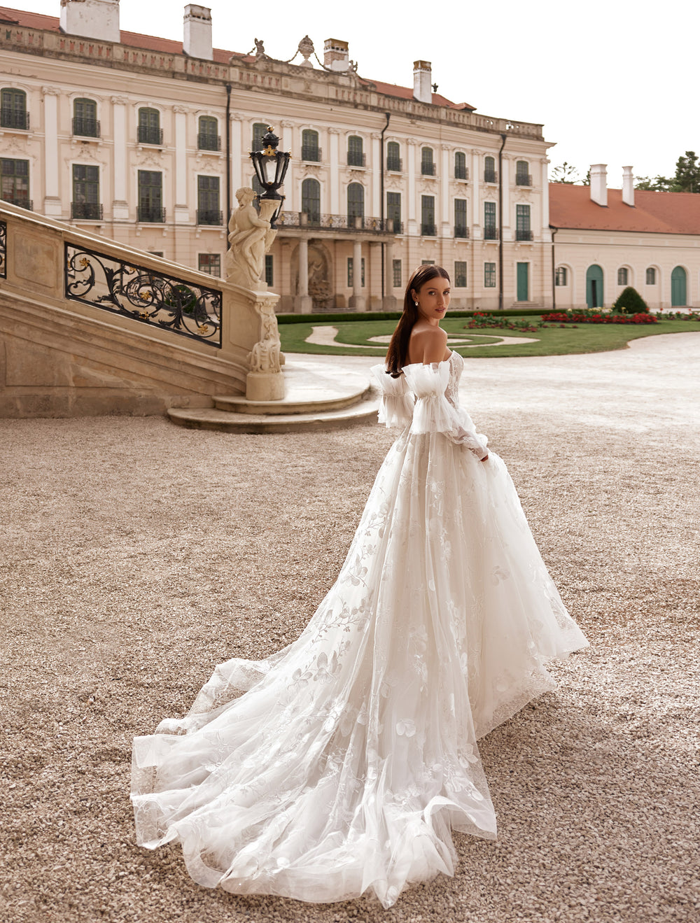Fusta A-line, realizată din straturi ușoare de tulle cu broderii florale pe toată suprafața, cade fluid și se continuă într-o trenă amplă, perfectă pentru un moment de poveste.