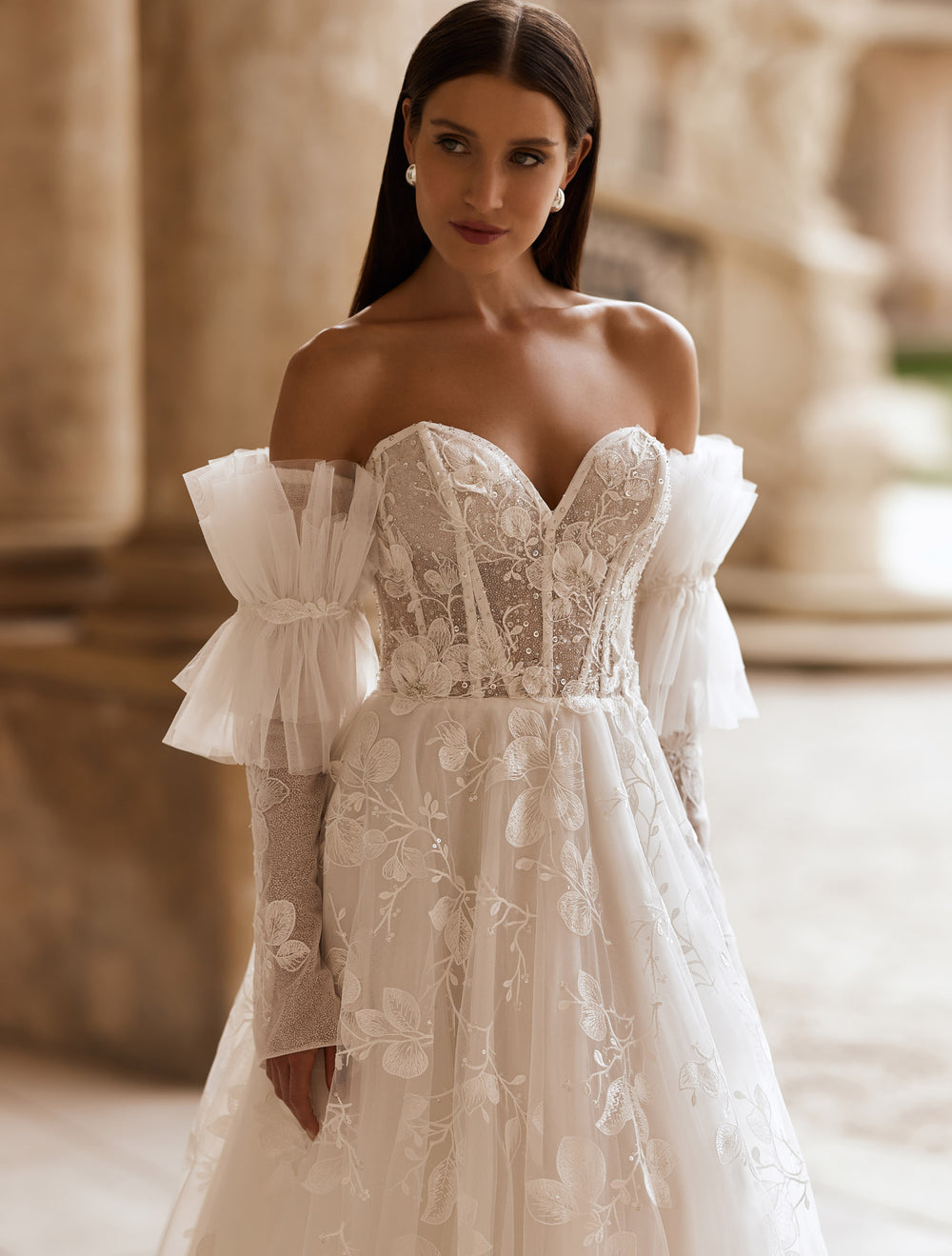 Corsetul cu decolteu inimă conturează elegant bustul, în timp ce mânecile căzute, vaporoase, din tulle creează un look irezistibil de feminin.