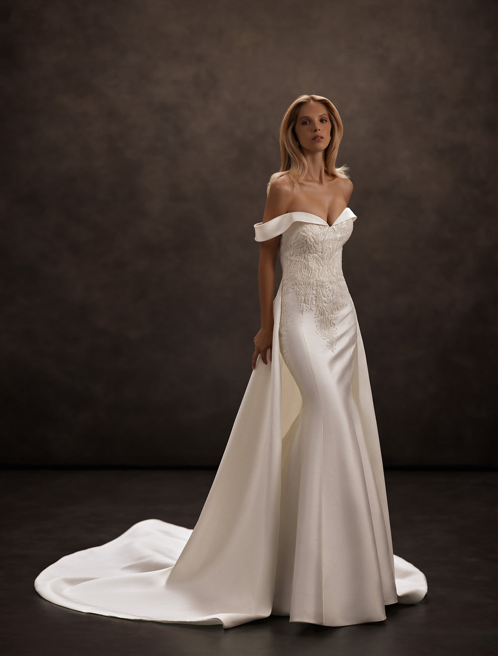 J-1146 este o rochie tip sirenă care îmbrățișează grațios formele, realizată dintr-o țesătură cu ținută și luciu satinat discret. Corsetul cu decolteu inimă și umeri căzuți conturează delicat zona bustului, iar aplicațiile de dantelă brodate, dispuse vertical, alungesc silueta și adaugă o notă couture. Fusta curată se deschide ușor de la genunchi într-un evazament fluid, continuat de o trenă elegantă de lungime medie – perfectă pentru un pas sigur și o apariție memorabilă.