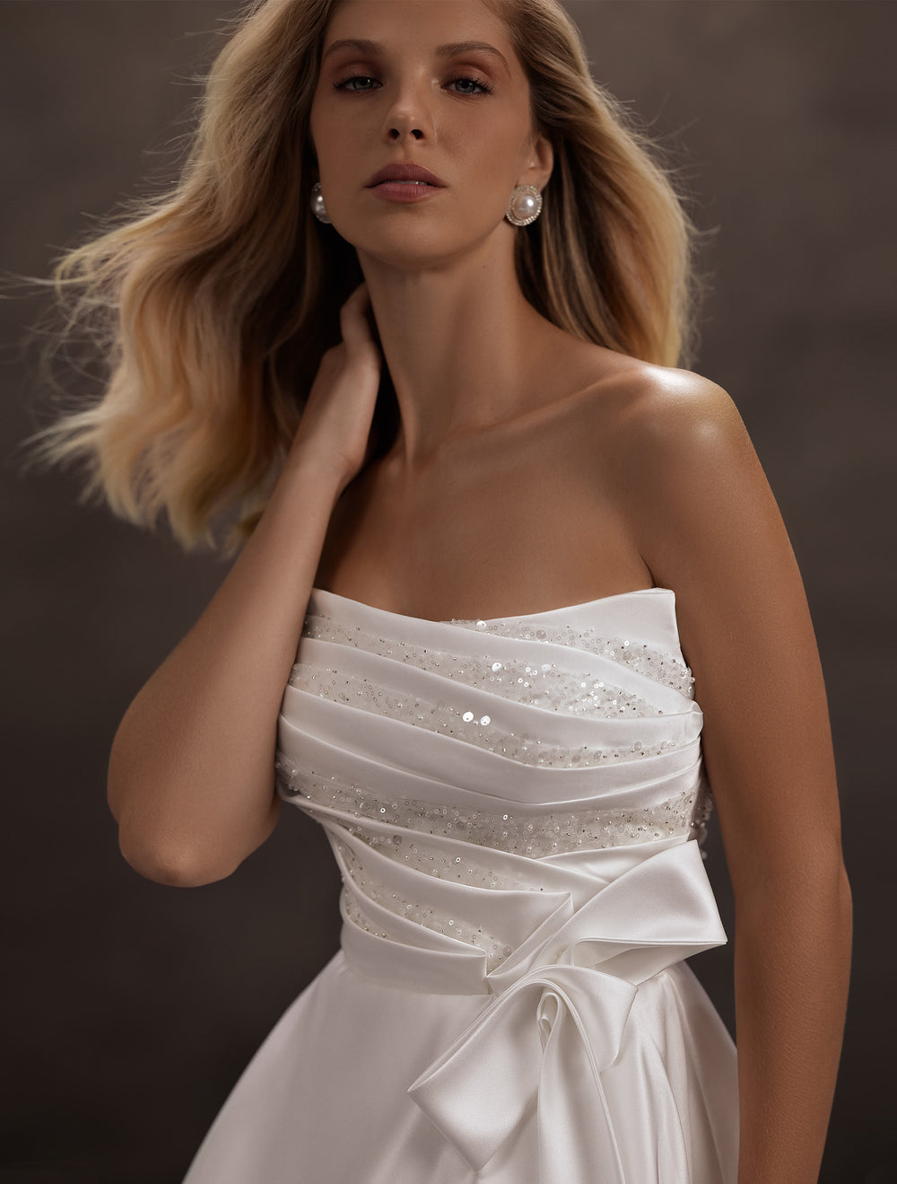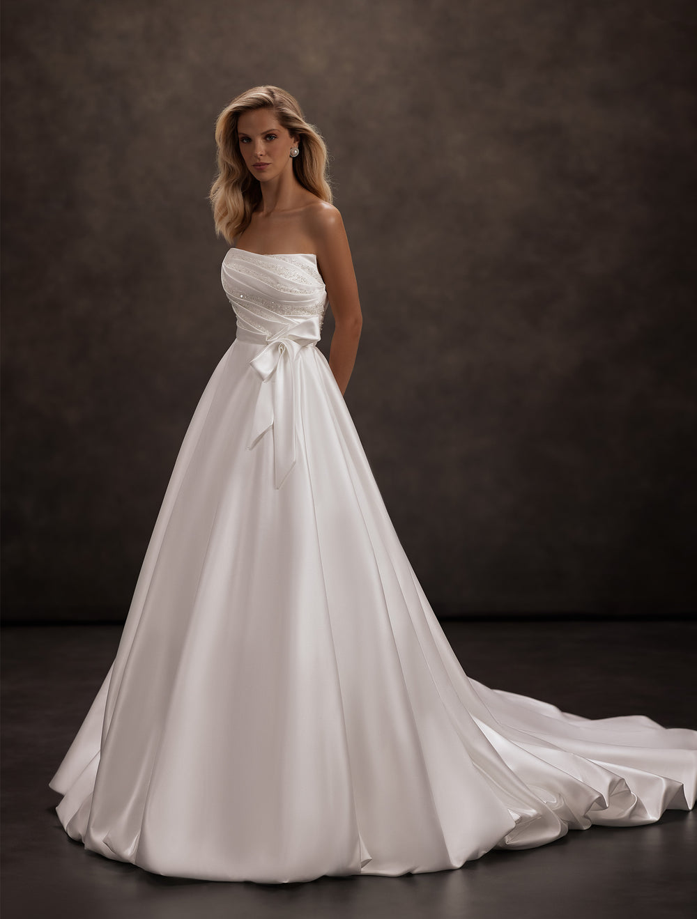 J-1148 îmbină eleganța atemporală cu rafinamentul modern. Confecționată din satin cu luciu mătăsos, rochia are o linie amplă tip A/Princess care alungește silueta și creează o prezență regală. Corsajul bustieră, fără bretele, este drapat fin și presărat cu aplicații delicate, iar funda laterală subțiază vizual talia și adaugă o notă romantică. Fusta bogată cade în pliuri moi și se continuă într-o trenă grațioasă, perfectă pentru un moment de intrare spectaculos.