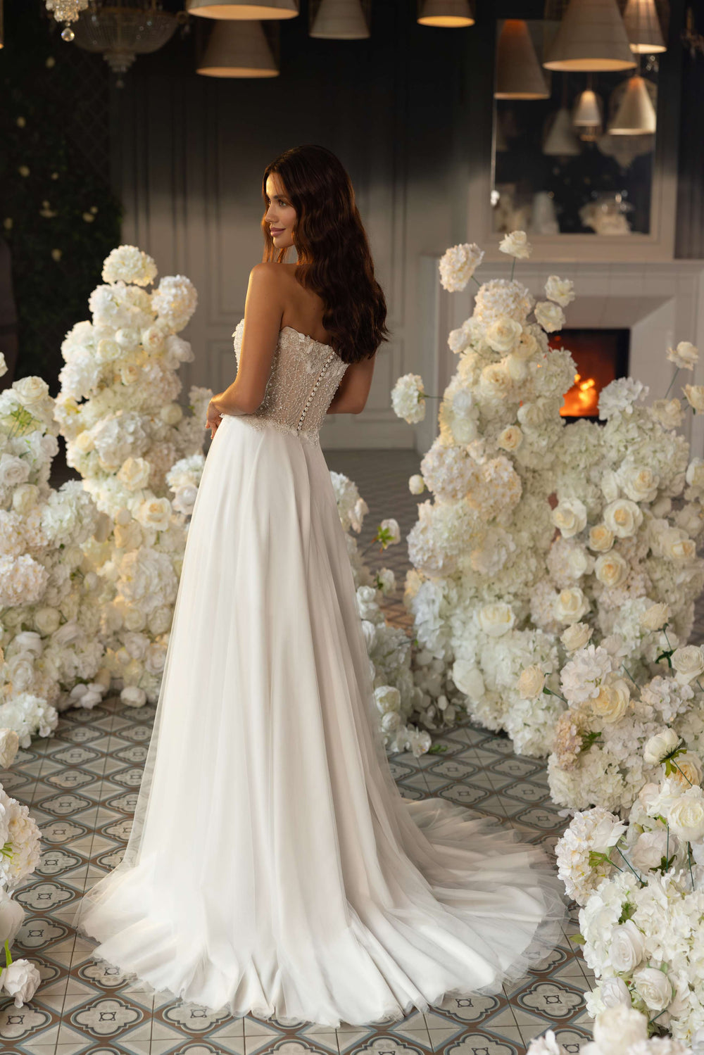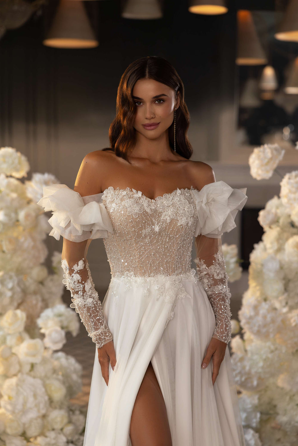 Mânecile lungi tip iluzie, ornate până la încheietură, sunt completate de accente voluminoase din tulle la brațe, pentru un efect couture. Fusta în A, fluidă și lejeră, din straturi diafane de tulle, are o despicătură elegantă pe picior și se prelungește într-o trenă ușoară – perfectă pentru un pas grațios și fotografii de poveste.