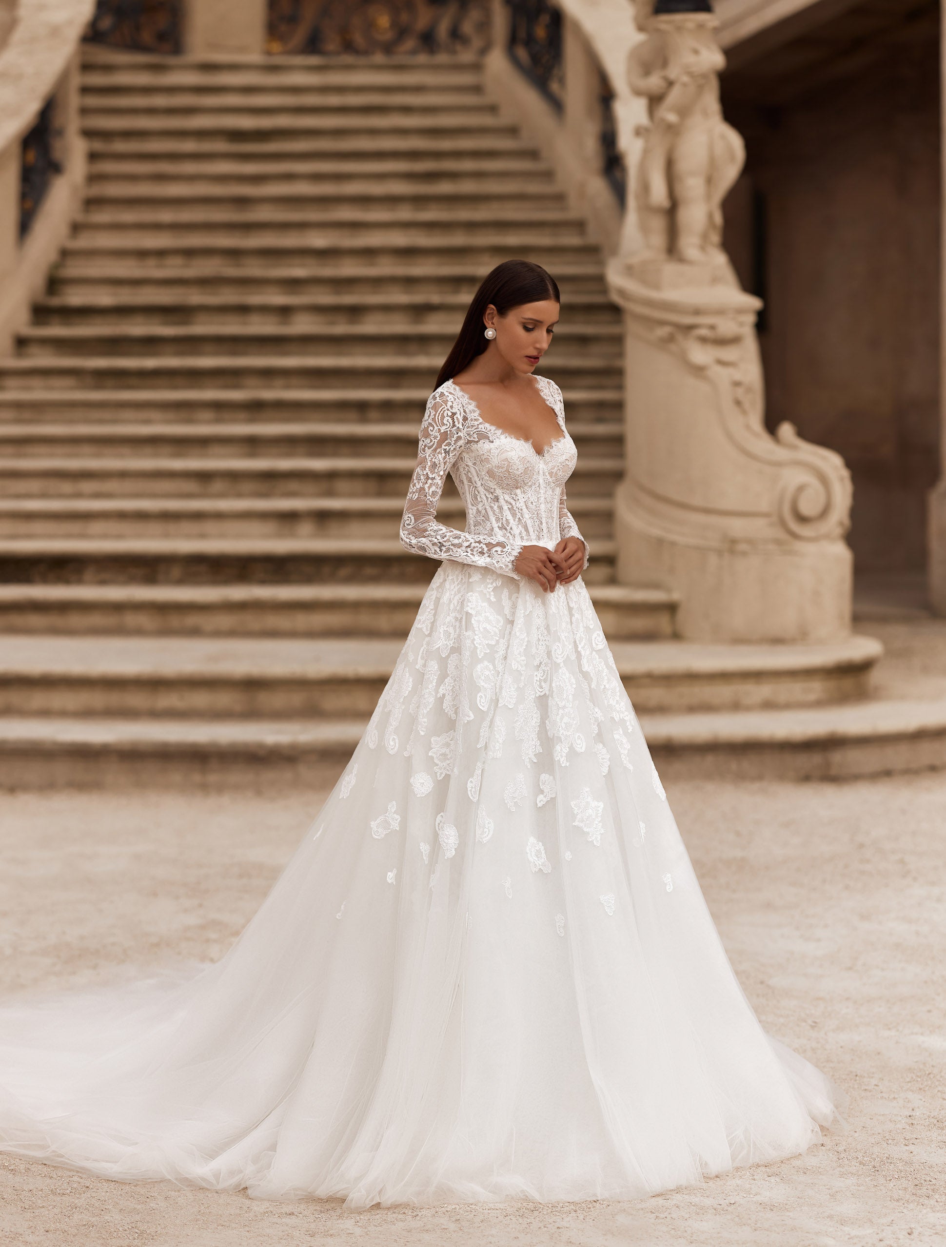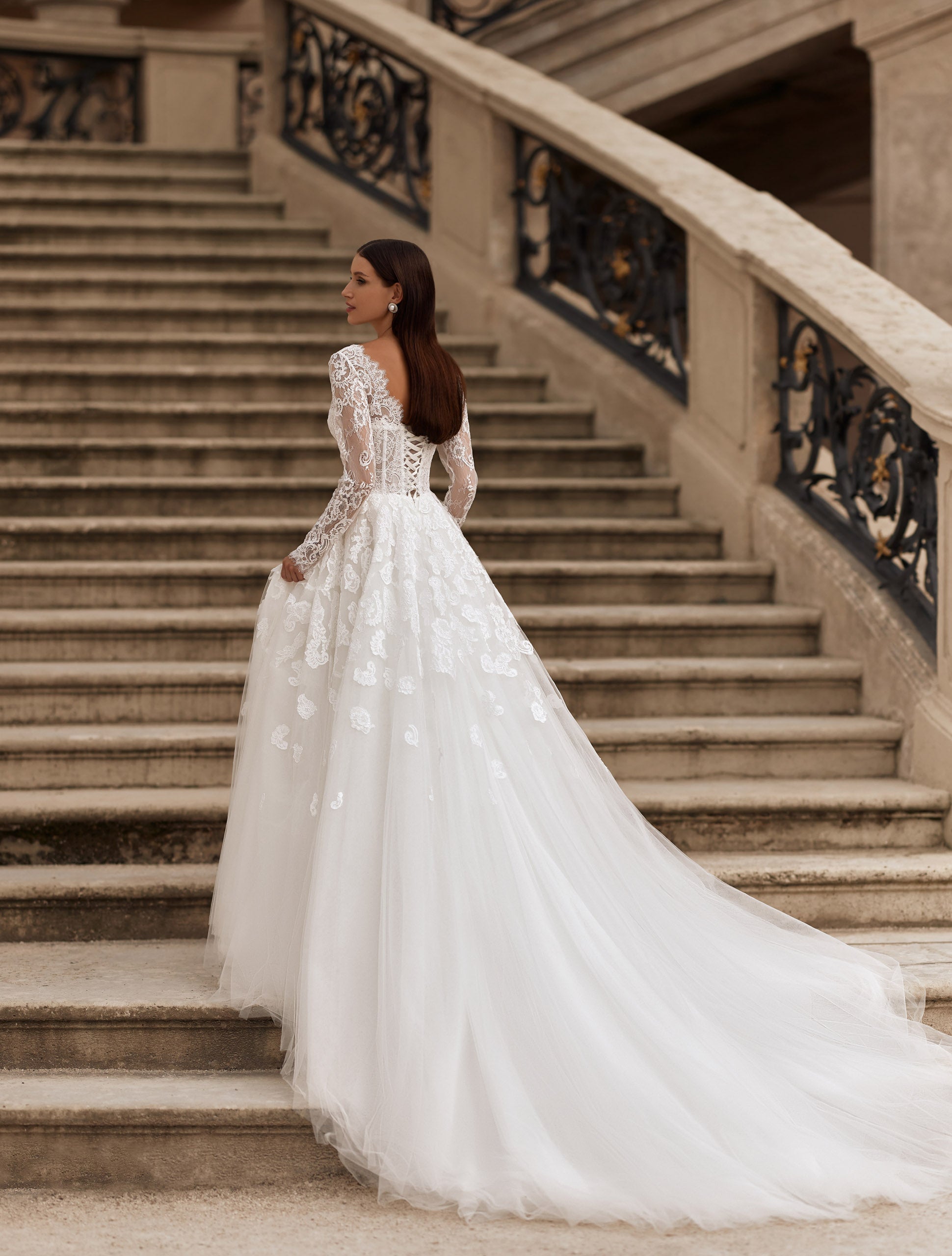 Marceline îmbină romantismul clasic cu strălucirea modernă. Corsetul tip bustieră, acoperit de un tulle iluzie fin, este decorat cu aplicații prețioase și șiraguri de perle care cad delicat peste umeri și brațe, transformând rochia într-o adevărată bijuterie. Talia bine definită se continuă într-o fustă amplă, fluidă, cu un luciu diafan și un motiv discret texturat, care curge într-o trenă regală pentru un efect spectaculos la intrare și în fotografii.