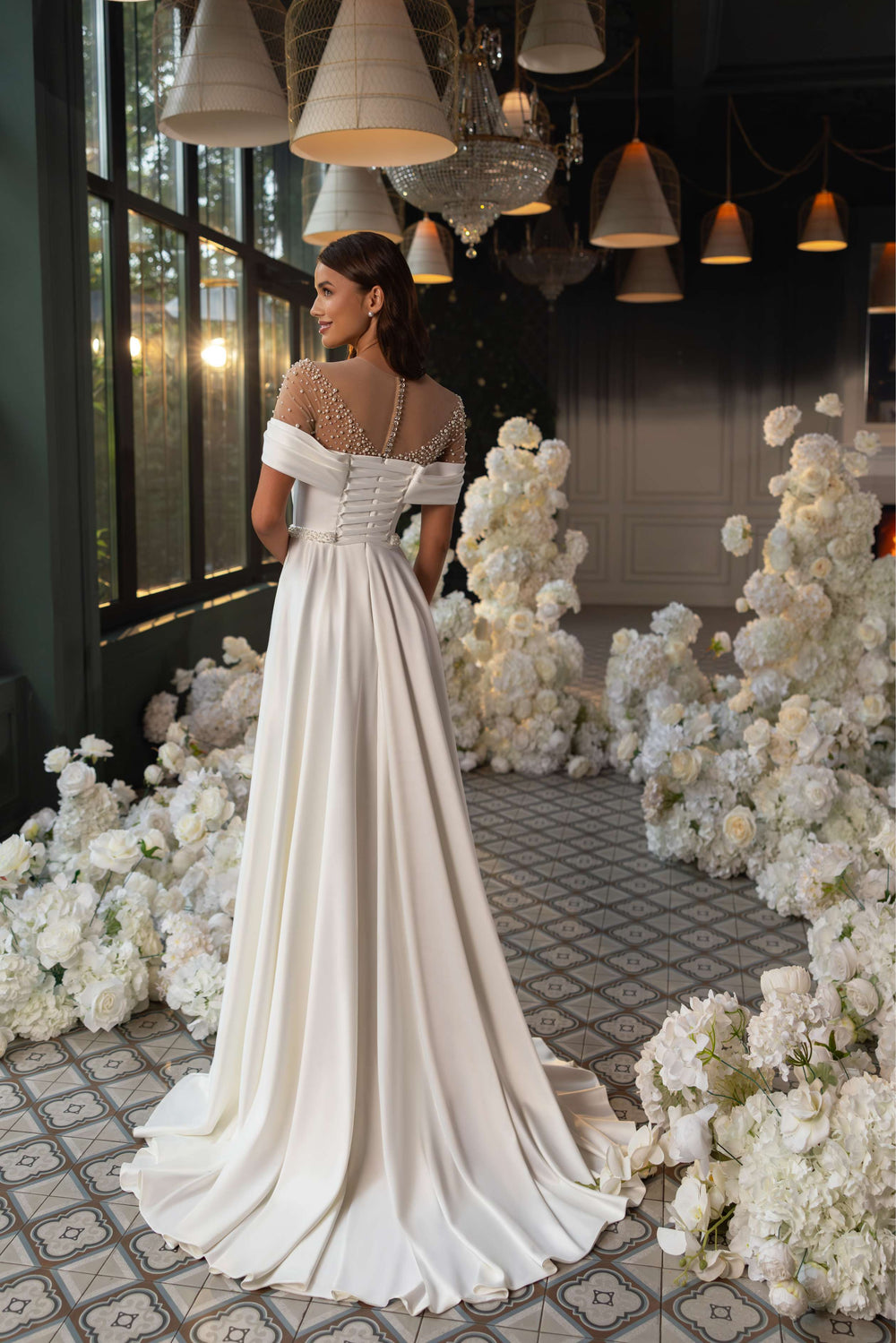 Talia este subliniată de un brâu perlat, iar fusta amplă din satin cu cădere mătăsoasă curge fluid, dezvăluind, la fiecare pas, o despicătură îndrăzneață pe picior.