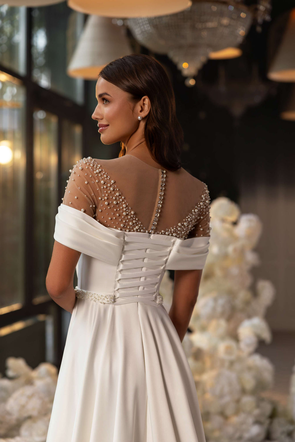 Corsetul cu pliseuri sculptate evidențiază linia bustului, în timp ce decolteul tip inimă, susținut de tulle fin, este încununat de umeri goi și aplicații delicate de perle.