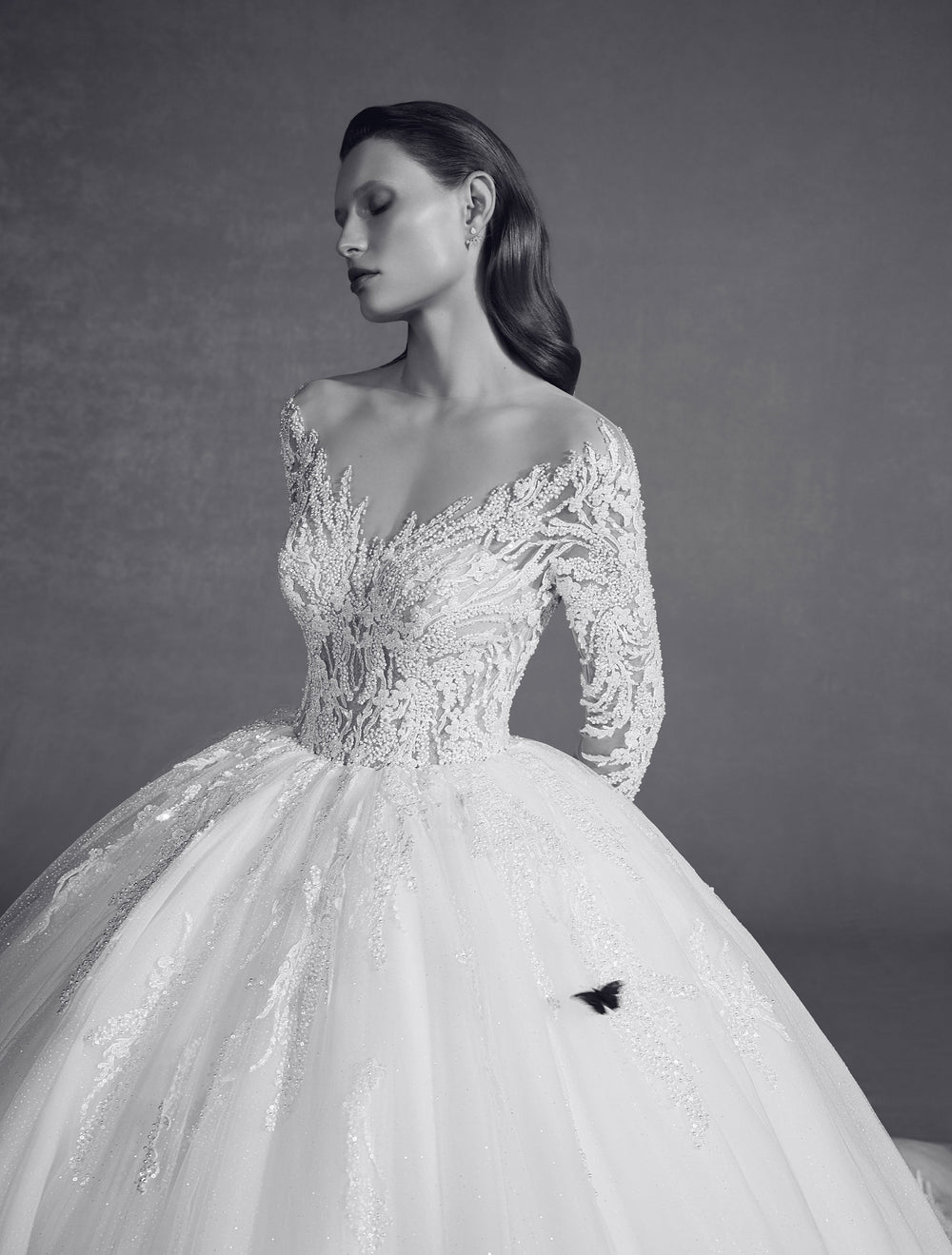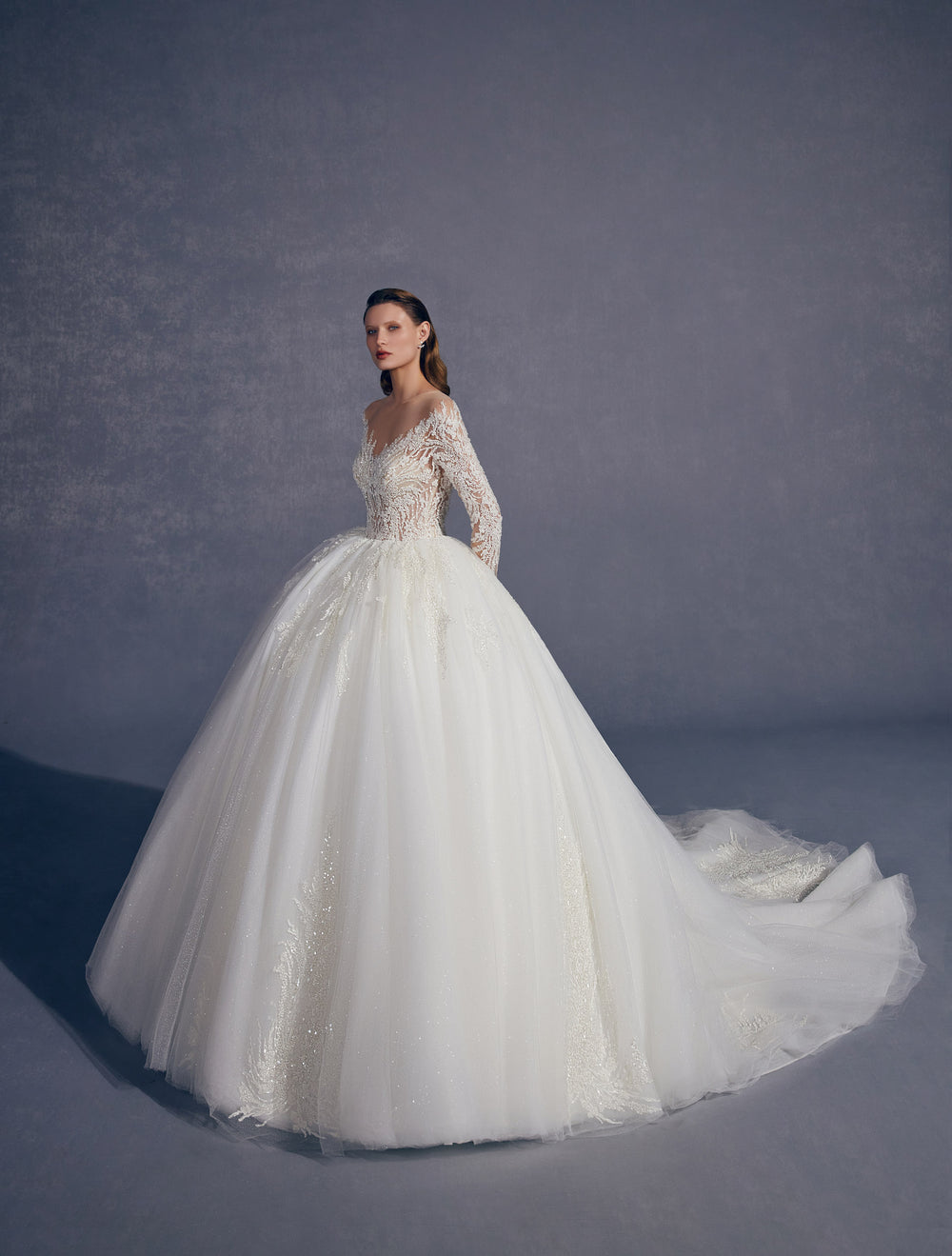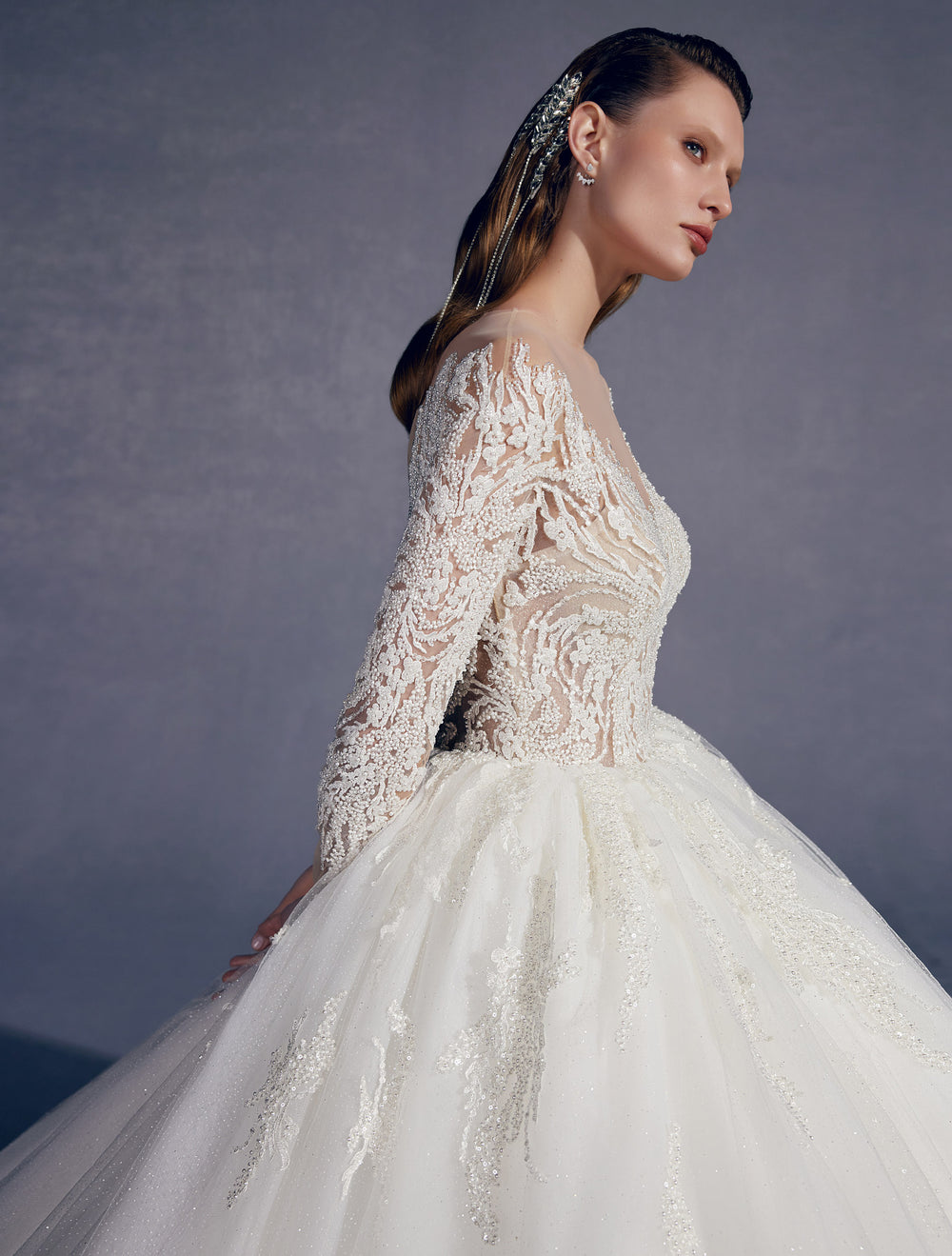 Această rochie de mireasă reprezintă alegerea perfectă pentru cea care își dorește să fie în centrul atenției, păstrând un echilibru perfect între clasic și contemporan, lux și comoditate.