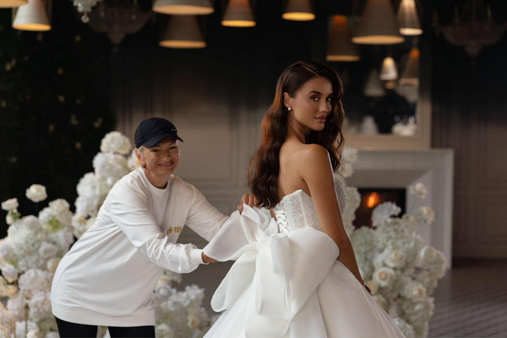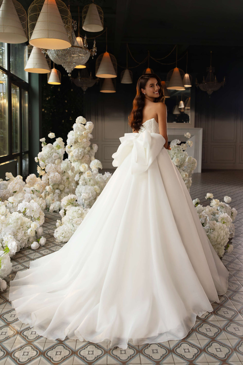 Tendenessy este alegerea perfectă pentru mireasa care își dorește eleganță atemporală cu un strop de strălucire modernă. Corsetul cu structură fină pe baleine sculptează delicat silueta, fiind îmbrăcat în dantelă și aplicații sclipitoare cusute manual.