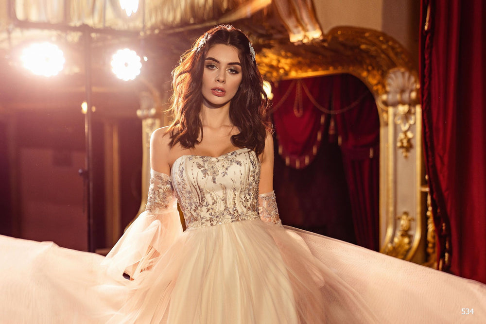 Rochie de mireasă prințesă cu corset sculptural și mâneci off‑the‑shoulder din dantelăO rochie de mireasă spectaculoasă, cu siluetă prințesă, corset tip bustieră cu baleine vizibile și dantelă romantică. Mâneci lungi off‑the‑shoulder și fustă amplă din tulle brodat cu paiete fine pentru un luciu discret.Creată...