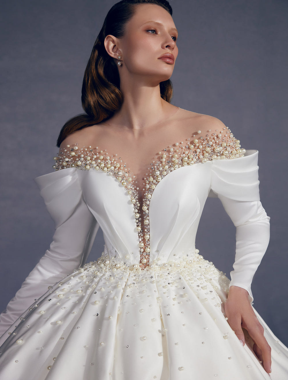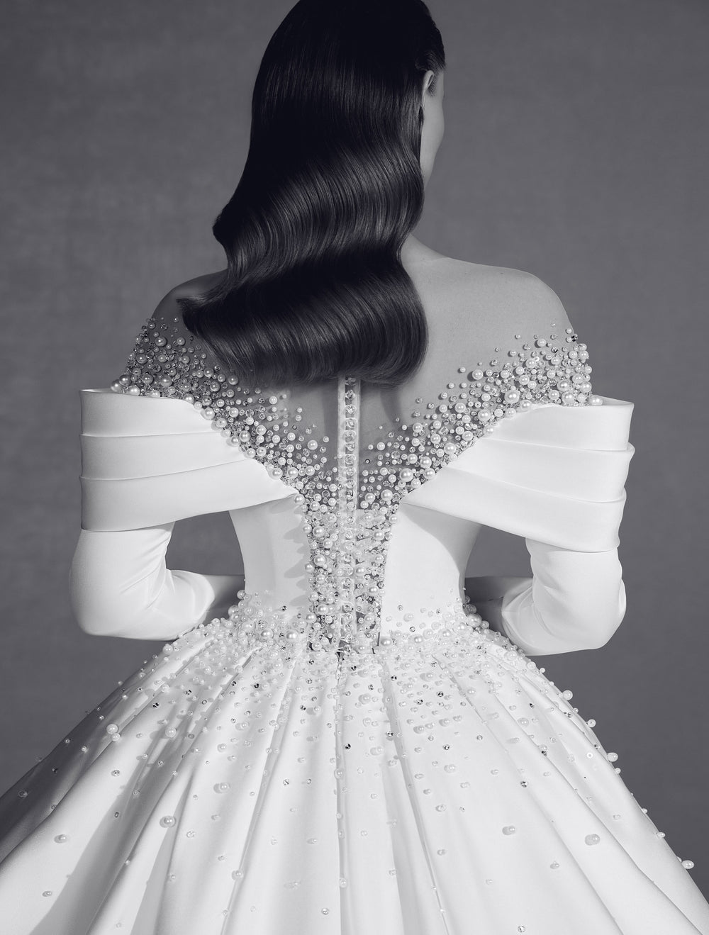Detaliile din dantelă și perle delicate sunt aplicate manual pe bust și la talie, creând un efect de continuitate și un aer de exclusivitate. Sistemul de închidere cu nasturi îmbrăcați la spate accentuează stilul clasic, fără a compromite confortul miresei.