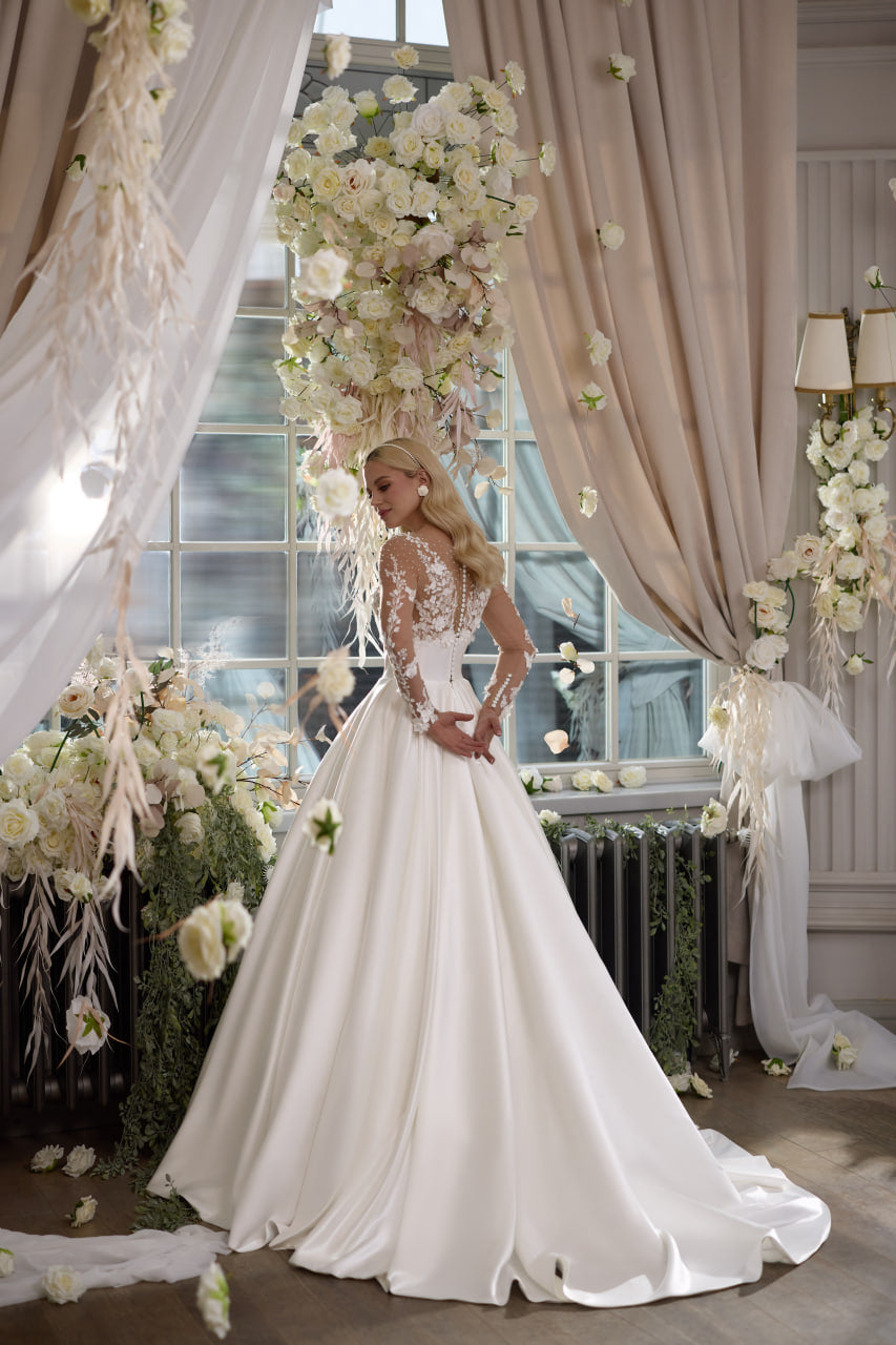 Partea superioară a rochiei este prevăzută cu un corset romantic, îmbrăcat în dantelă fină. Aceasta se remarcă prin mânecile lungi transparente, decorate cu aplicații florale delicate, ce adaugă un aer eteric și sofisticat. Decolteul în V, atât în partea din față, cât și pe spate, este îndrăzneț dar elegant, oferind un echilibru perfect între romantism și modernitate.