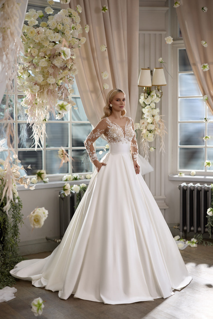 Rochia de mireasă Chloe impresionează prin silueta sa A-line clasică putin spre printesă, ce se potrivește perfect multor tipuri de corp, asigurând o imagine de poveste. Confecționată din satin de cea mai înaltă calitate, această rochie combină moalețea cu strălucirea subtilă, garantând astfel un confort inegalabil și o prezență strălucitoare.